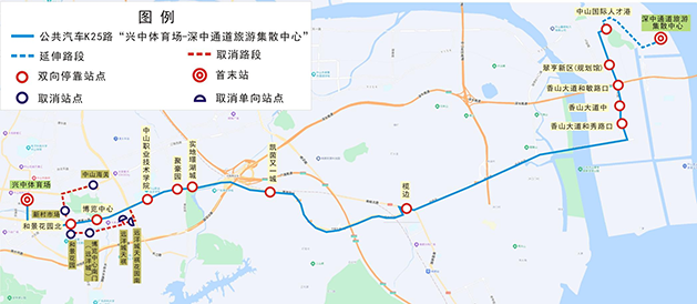 为完善翠亨新区交通配套,结合翠亨新区居民、深中通道旅客出行需求及中山客运口岸建设情况。我公司拟优化整合公共汽车098、k25路为k25路“兴中体育场-深中通道旅游集散中心”,新开通公共汽车k27路“紫岭天玺-中山客运口岸”及k29路“海湾城公交枢纽站-中山客运口岸”。具体情况如下: