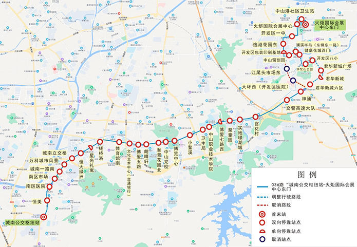 为进一步扩大公交服务覆盖范围,方便群众公交出行。我公司拟优化调整公共汽车036路线“城南公交枢纽站-火炬国际会展中心东门”部分行驶路段及延长线路服务时间。具体情况如下: