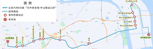 一、公共汽车k25路线延伸为“兴中体育场-中山客运口岸”