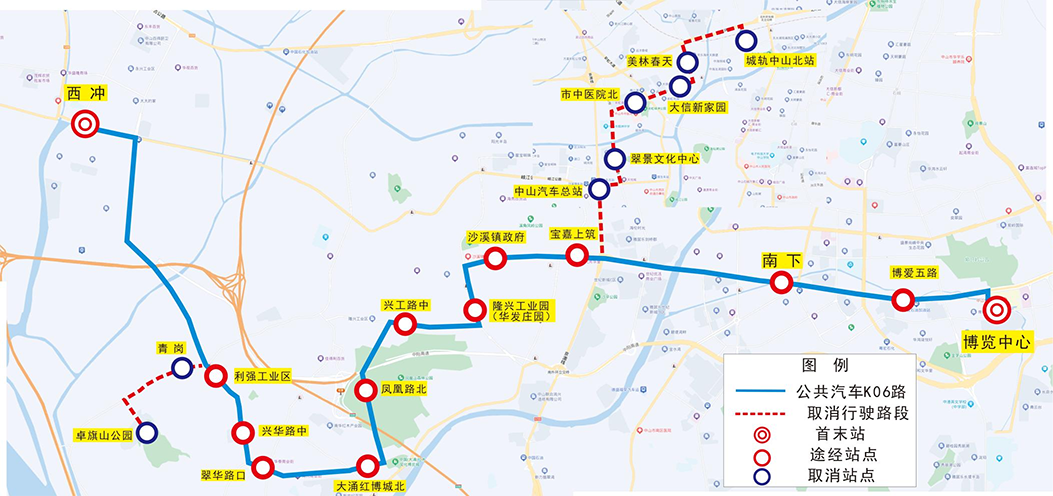 为进一步提升公交资源利用率,降低线路重复率,提高公交运力投放的精准率,同时接驳深中跨市公交。我公司拟计划调整k06路为“博览中心—西冲”并同步取消公共汽车l07路,具体情况如下: