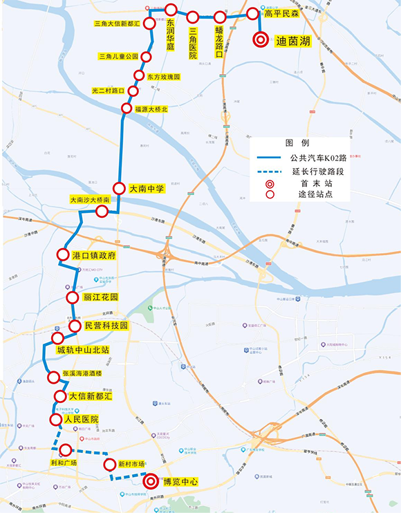 博览中心、新村市场、利和广场、人民医院、大信新都汇、张溪海港酒楼、城轨中山北站、民营科技园、丽江花园、港口镇政府、大南沙大桥南、大南中学、福源大桥北、光二村路口、东方玫瑰园、三角儿童公园、三角大信新都汇、东润华庭、三角医院、蟠龙路口、高平民森、迪茵湖