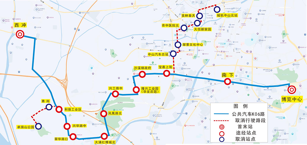 博览中心、南下、宝嘉上筑、沙溪镇政府、隆兴工业园(华发庄园)、兴工路中、凤凰路北、大涌红博城北、翠华路口、兴华路中、利强工业区、西冲