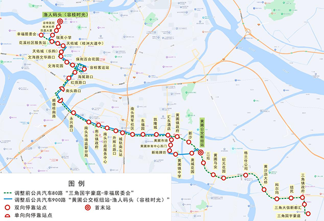 二、公共汽车80路优化调整为“黄圃公交枢纽站—渔人码头(容桂时光)”并调整线路编号为900路