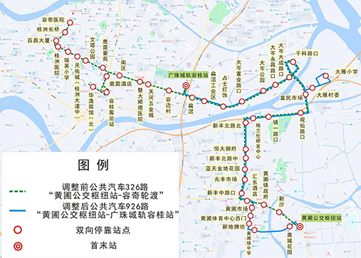 三、公共汽车326路优化调整为“黄圃公交枢纽站—广珠城轨容桂站”并调整线路编号为926路