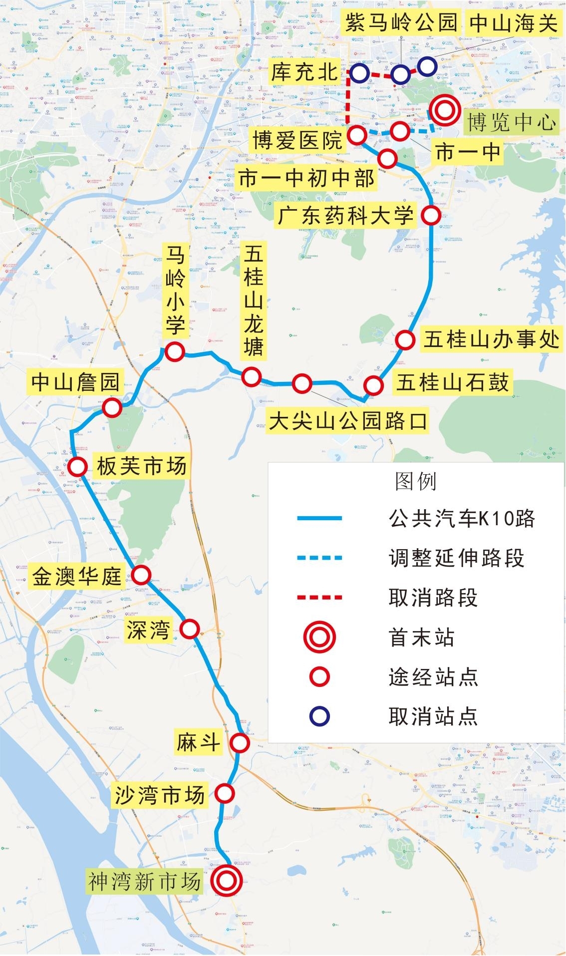 博览中心、市一中、博爱医院、市一中初中部、广东药科大学、五桂山办事处、五桂山石鼓、大尖山公园路口、五桂山龙塘、马岭小学、中山詹园、板芙市场、金澳华庭、深湾、麻斗、沙湾市场、神湾新市场。