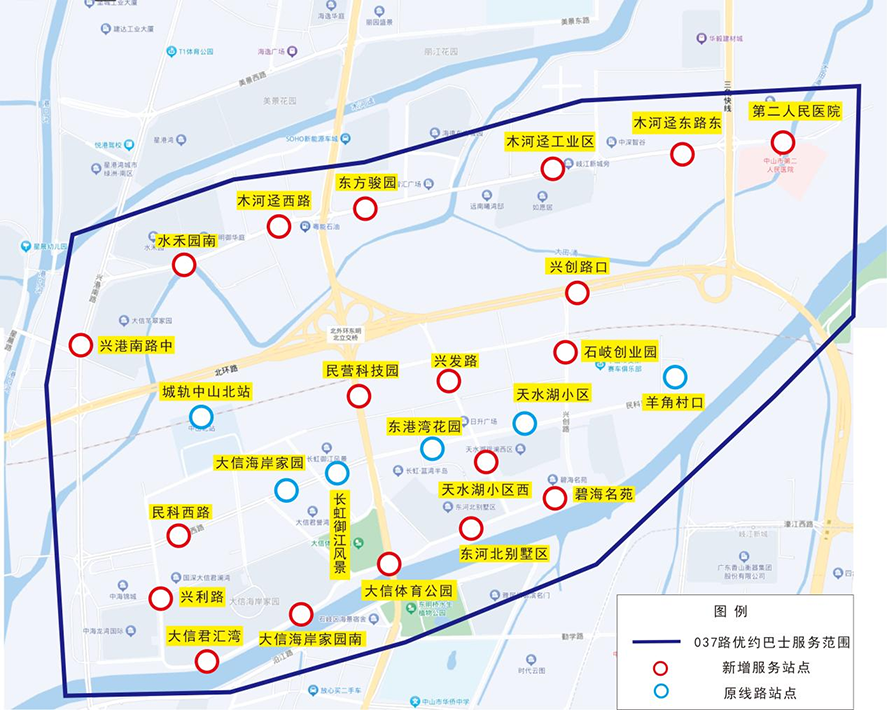 (二)服务站点(下划线标注为新增站点) 第二人民医院、木河迳东路东、木河迳工业区、水禾园南、东方骏园、民营科技园、木河迳西路、兴港南路中、城轨中山北站、大信海岸家园、长虹御江风景(石岐区行政服务中心)、东港湾花园、天水湖小区、洋角口村、民科西路、兴创路口、兴发路、兴利路、大信君汇湾、大信海岸家园南、大信体育公园、天水湖小区西、东河北别墅区、碧海名苑、石岐创业园。 (三)线路信息“响应发车”模式的服务时间为7:00-19:00,投放1辆中型客车运行,采用新型的响应式公交模式,无固定地点,无固定发车时间,乘客网络下单,车辆根据需求接单发车。