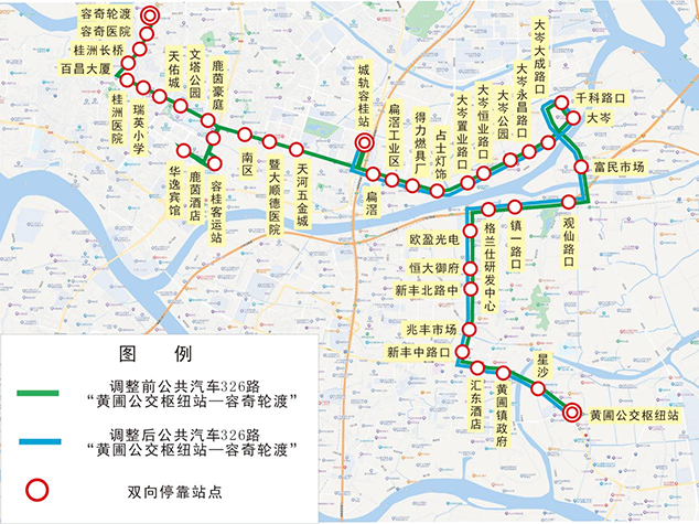 二、公共汽车326路优化调整为“黄圃公交枢纽站—广珠城轨容桂站”