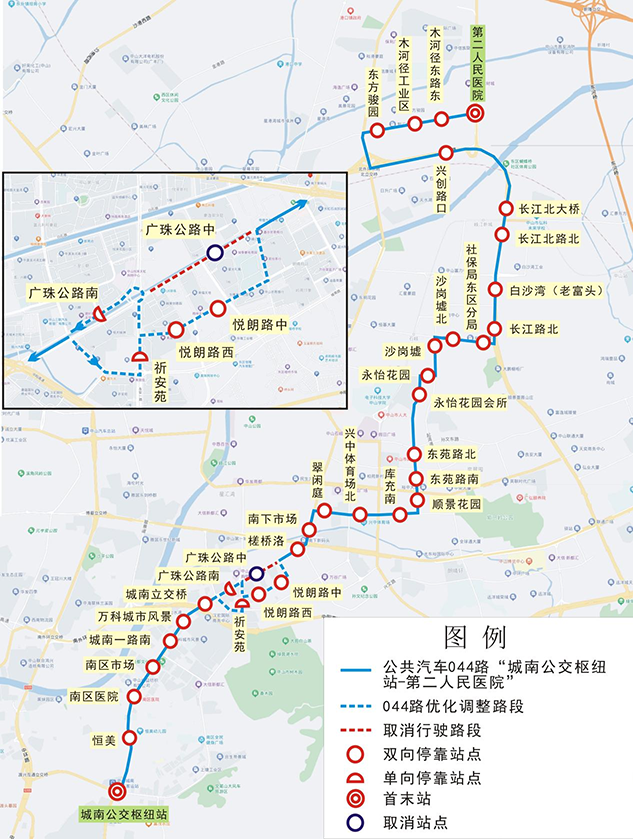 为进一步扩大公交服务覆盖范围,填补东区新建道路公交空白,方便群众公交出行,我公司拟优化调整公共汽车044路线“城南公交枢纽站—第二人民医院”部分行驶路段。具体情况如下: