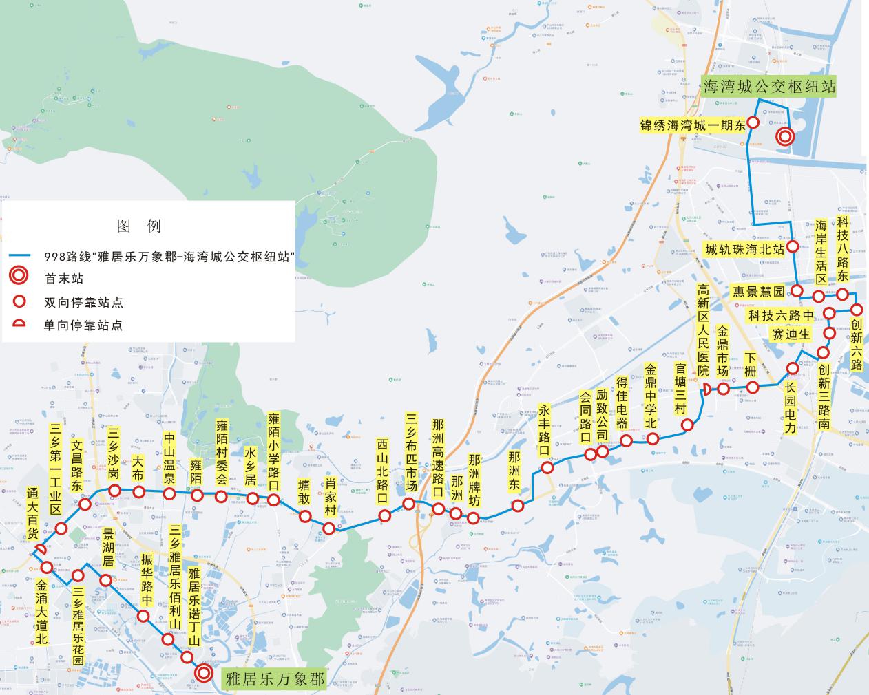 (二)延伸998路为“雅居乐万象郡-海湾城公交枢纽站”;