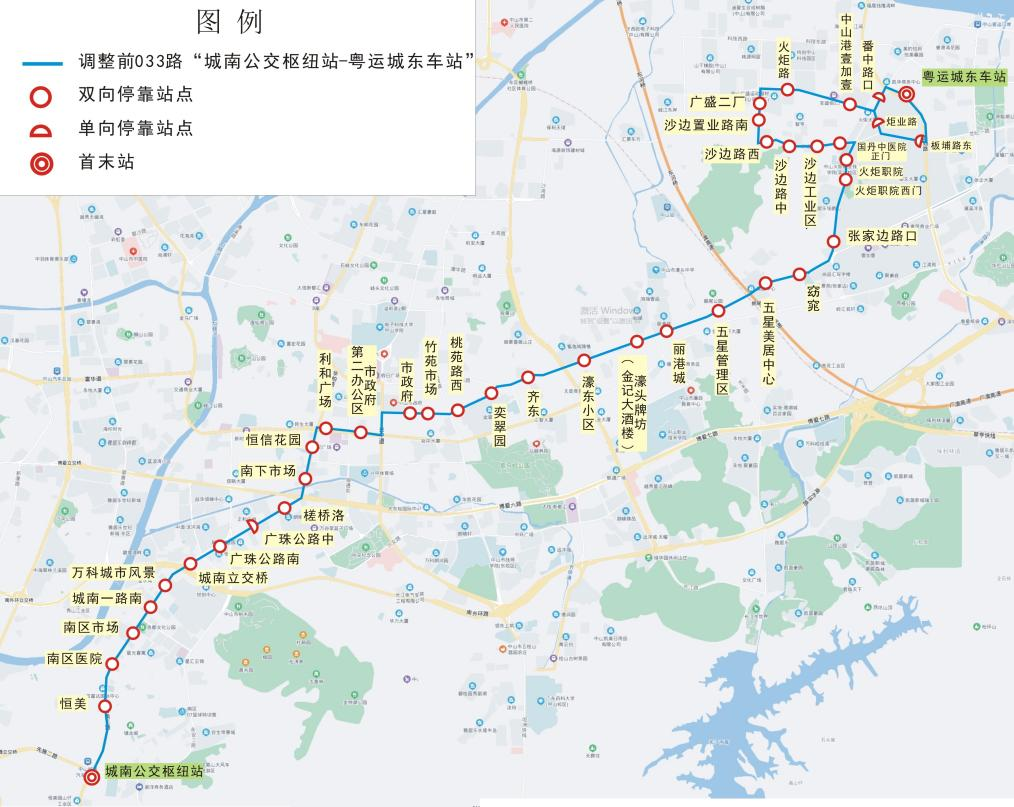 城南公交枢纽站、恒美、南区医院、南区市场、城南一路南、万科城市风景、城南立交桥、广珠公路南、广珠公路中(往火炬国际会展中心东门方向单向站)、槎桥洛、南下市场、恒信花园、利和广场、市政府第二办公区、市政府、竹苑市场、桃苑路西、奕翠园、齐东、濠东小区、濠头牌坊(金记大酒楼)、丽港城、五星管理区、五星美居中心、窈窕、张家边路口、火炬职院西门、火炬职院、国丹中医院正门、沙边工业区、沙边路中、沙边路西、沙边置业路南、广盛二厂、中炬新天地、纬创科技园、火炬软件园、科技东路、科技东路东、安居花园、中山港社区卫生站、火炬国际会展中心东门。