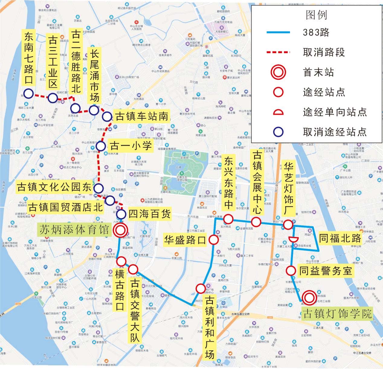 为进一步提高公交资源利用率,结合线路客流情况,我公司拟优化调整公共汽车383路线为“苏炳添体育馆-古镇灯饰学院”。具体情况如下: