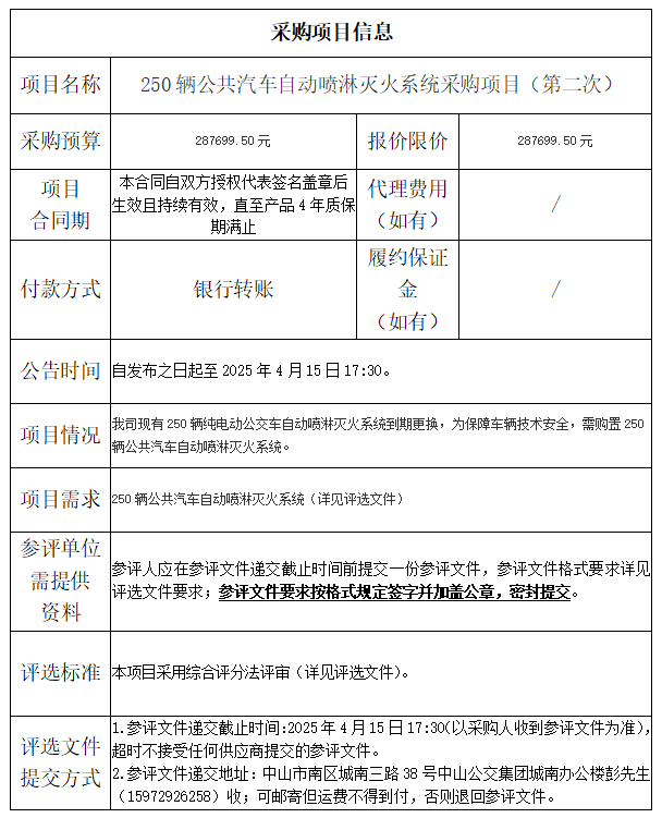 中山市公共交通运输集团有限公司250辆公共汽车自动喷淋灭火系统采购项目(第二次)