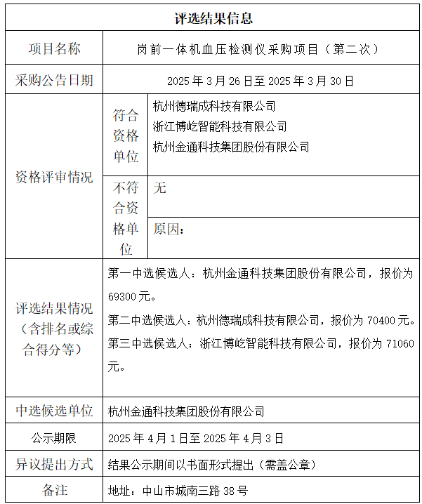 中山市公共交通运输集团有限公司岗前一体机血压检测仪采购项目(第二次)评选结果公示