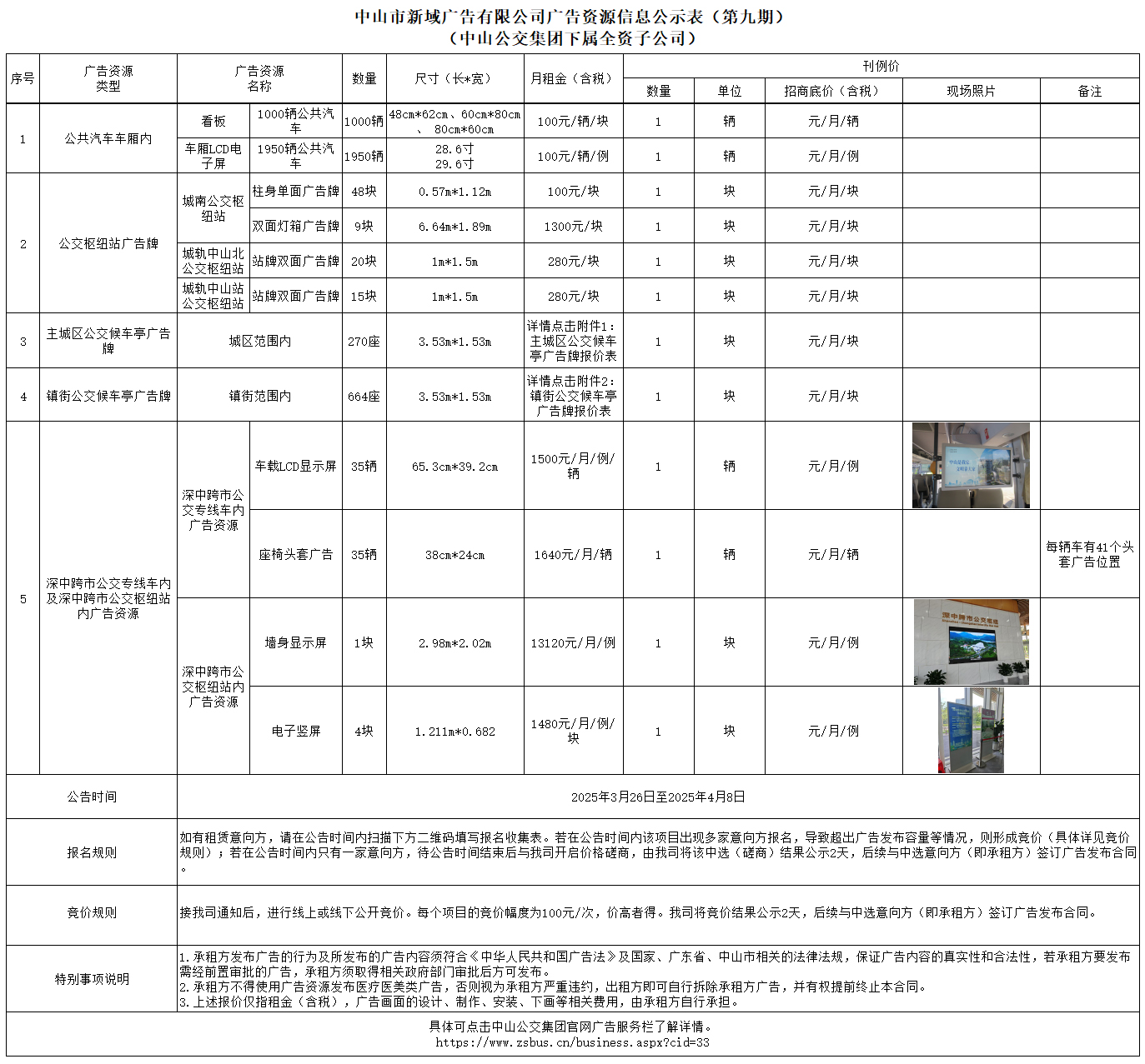 中山市新域广告有限公司广告资源信息公示表(第九期)(中山公交集团下属全资子公司)
