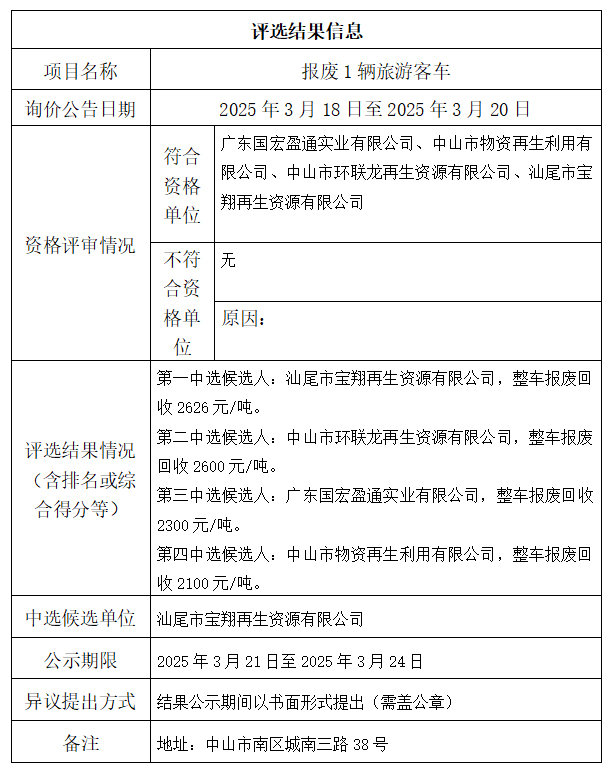 中山市公共交通运输集团有限公司报废1辆旅游客车评选结果公示