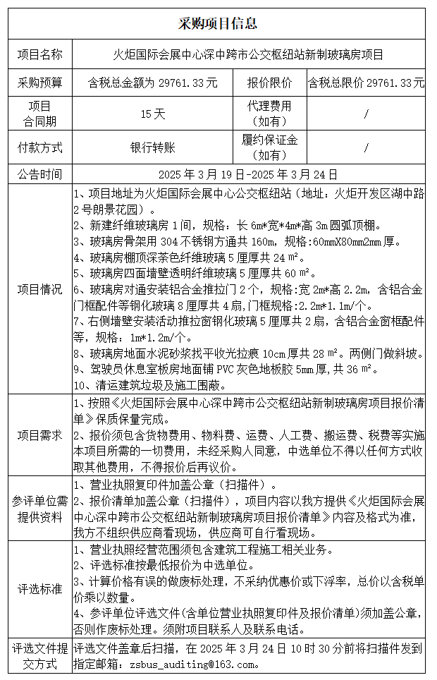 火炬国际会展中心深中跨市公交枢纽站新制玻璃房项目报价清单