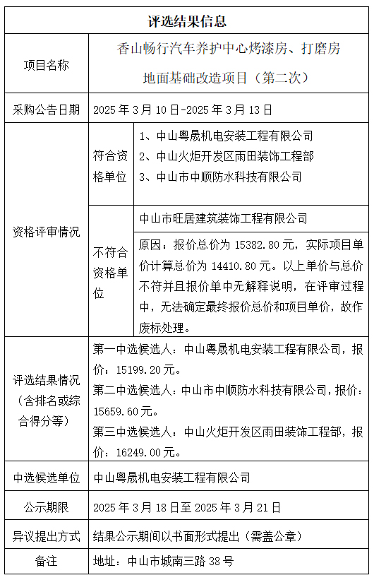 中山市公共交通运输集团有限公司香山畅行汽车养护中心烤漆房、打磨房地面基础改造项目(第二次)评选结果公示