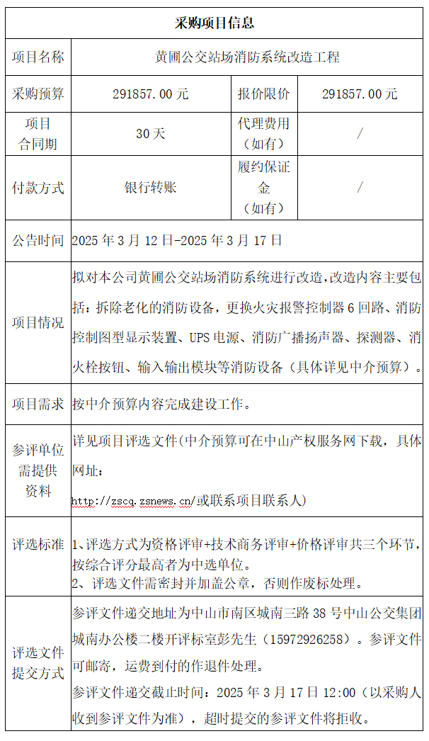 中山市公共交通运输集团有限公司黄圃公交站场消防系统改造工程