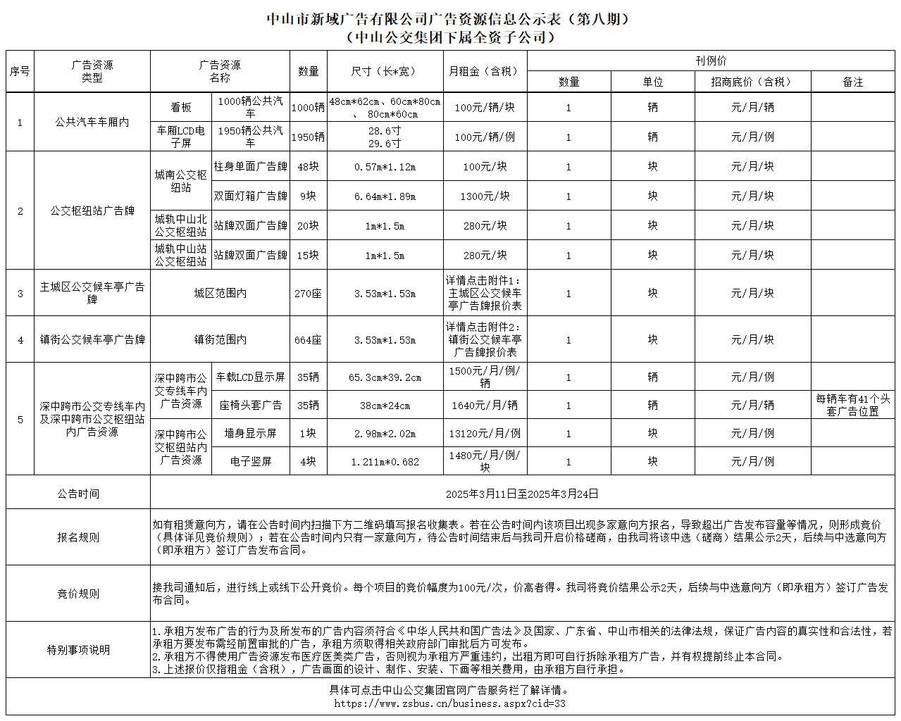 中山市新域广告有限公司广告资源信息公示表(第八期)(中山公交集团下属全资子公司)