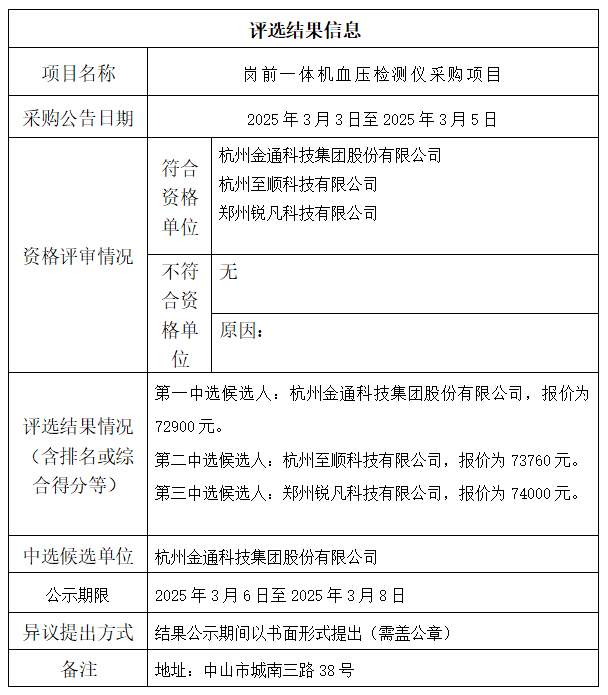 中山市公共交通运输集团有限公司岗前一体机血压检测仪采购项目评选结果公示