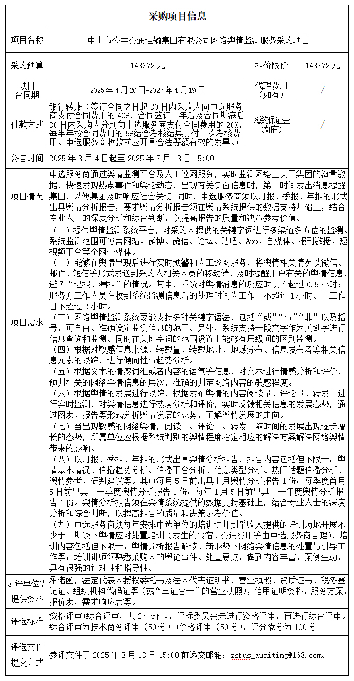 中山市公共交通运输集团有限公司网络舆情监测服务采购项目
