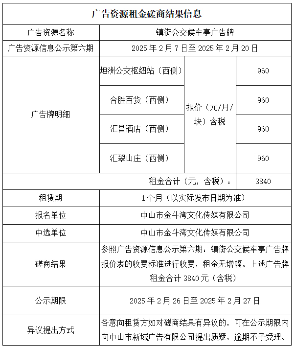 中山市新域广告有限公司广告资源租金磋商结果公示