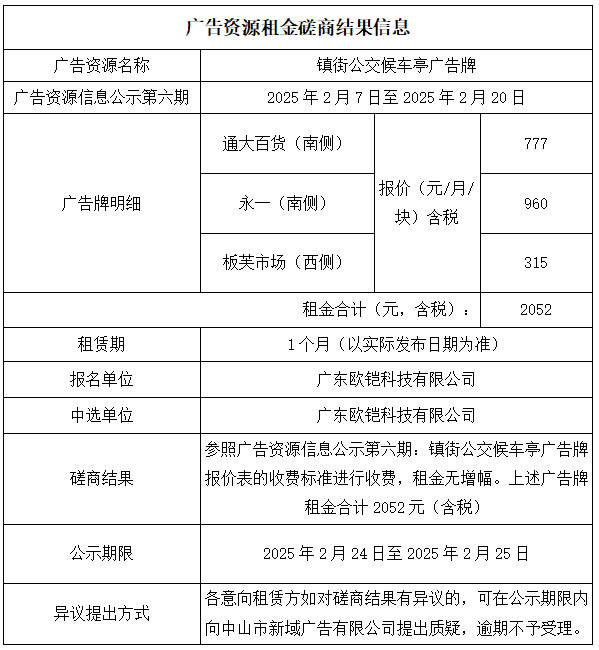 中山市新域广告有限公司广告资源租金磋商结果公示