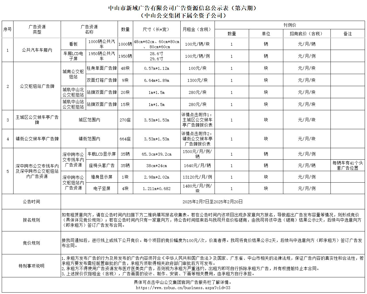 中山市新域广告有限公司广告资源信息公示表(第六期)(中山公交集团下属全资子公司)