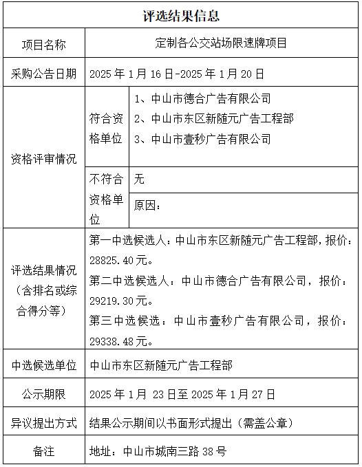 中山市公共交通运输集团有限公司定制各公交站场限速牌项目评选结果公示