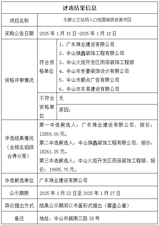 中山市公共交通运输集团有限公司乐群公交站场入口地面破损修复项目评选结果公示