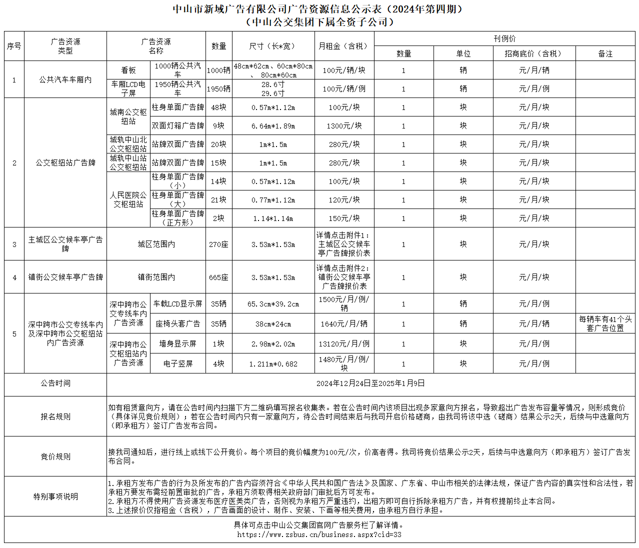 中山市新域广告有限公司广告资源信息公示表(2024年第四期)(中山公交集团下属全资子公司)