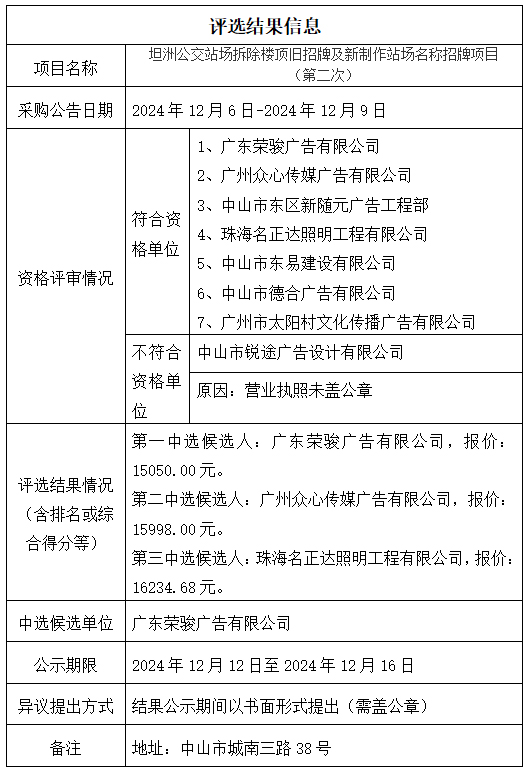 中山市公共交通运输集团有限公司坦洲公交站场拆除楼顶旧招牌及新制作站场名称招牌项目(第二次)评选结果公示