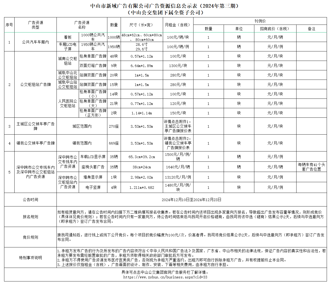 中山市新域广告有限公司广告资源信息公示表(2024年第三期)(中山公交集团下属全资子公司)