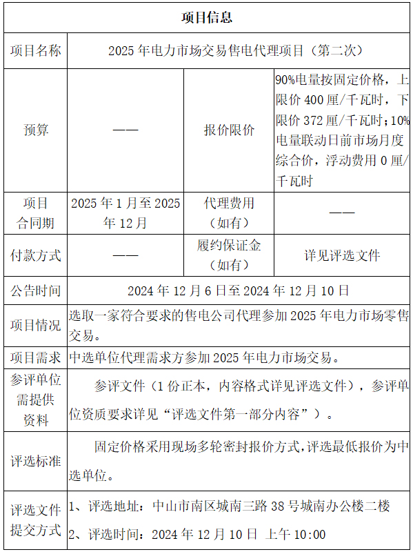 中山市公共交通运输集团有限公司2025年电力市场交易售电代理项目(第二次)