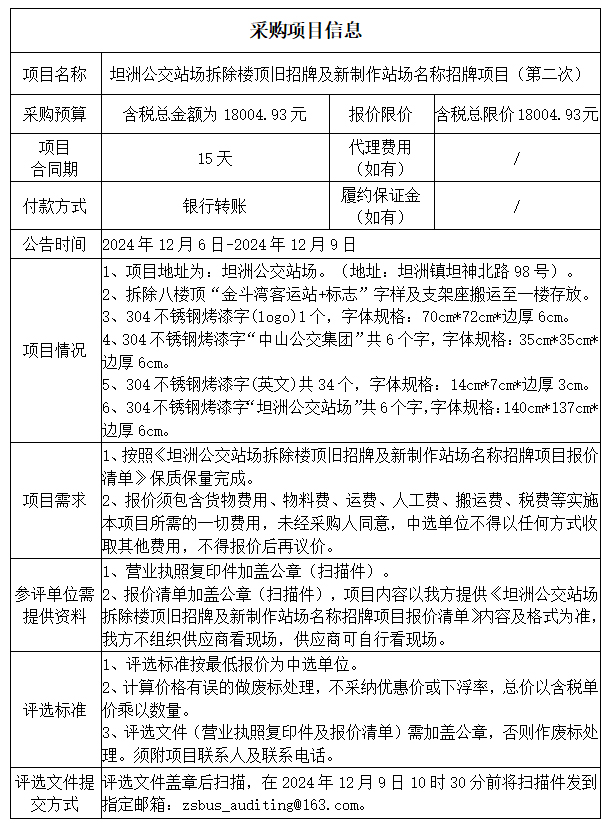 中山市公共交通运输集团有限公司坦洲公交站场拆除楼顶旧招牌及新制作站场名称招牌项目(第二次)