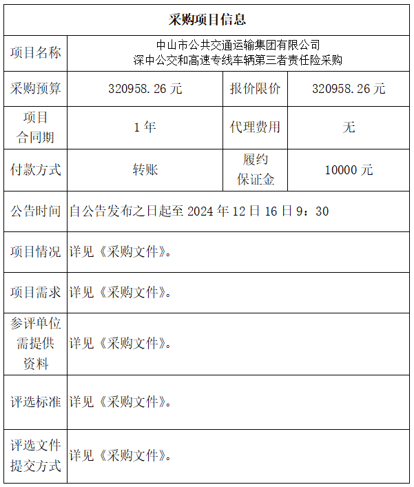 中山市公共交通运输集团有限公司深中公交和高速专线车辆第三者责任险采购项目