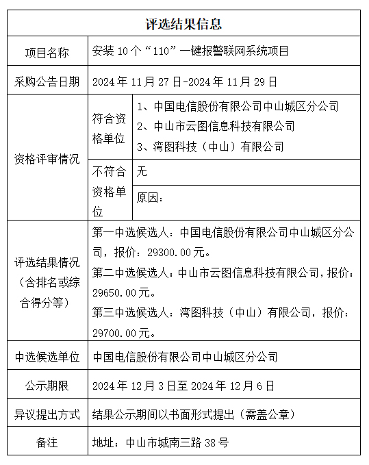 中山市公共交通运输集团有限公司安装10个“110”一键报警联网系统项目评选结果公示