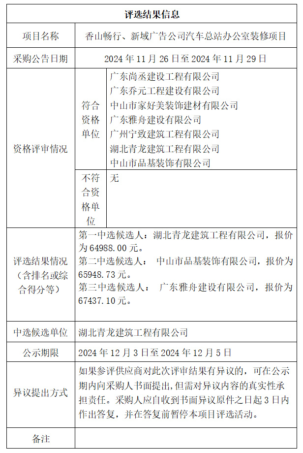 中山市公共交通运输集团有限公司香山畅行、新域广告公司汽车总站办公室装修项目评选结果公示
