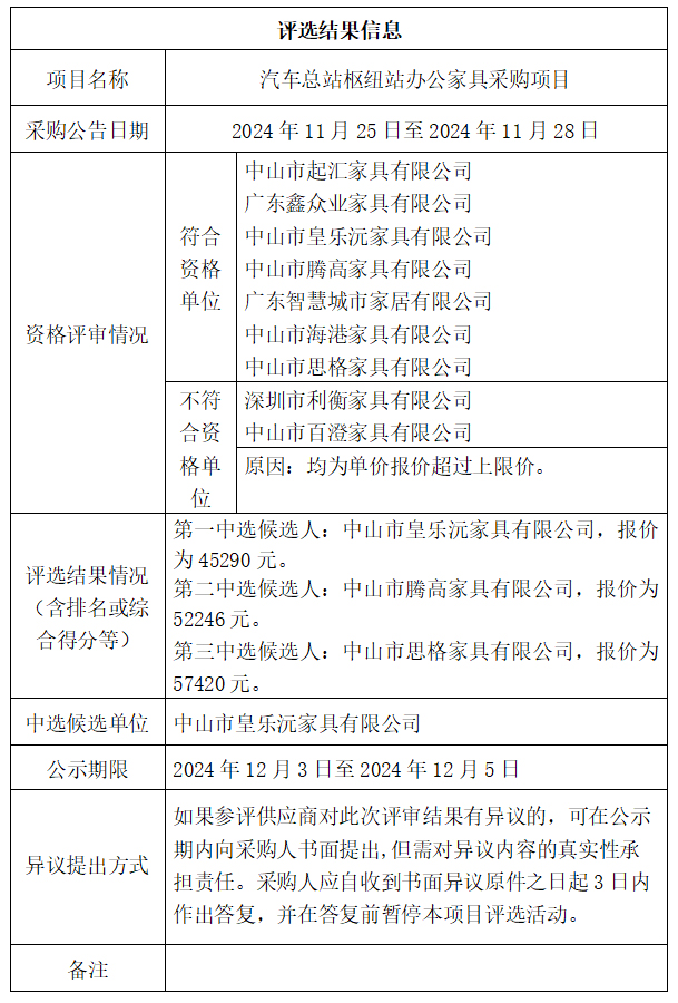 中山市公共交通运输集团有限公司汽车总站枢纽站办公家具采购项目评选结果公示