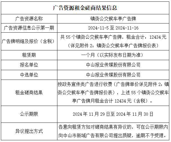 中山市新域广告有限公司广告资源租金磋商结果公示