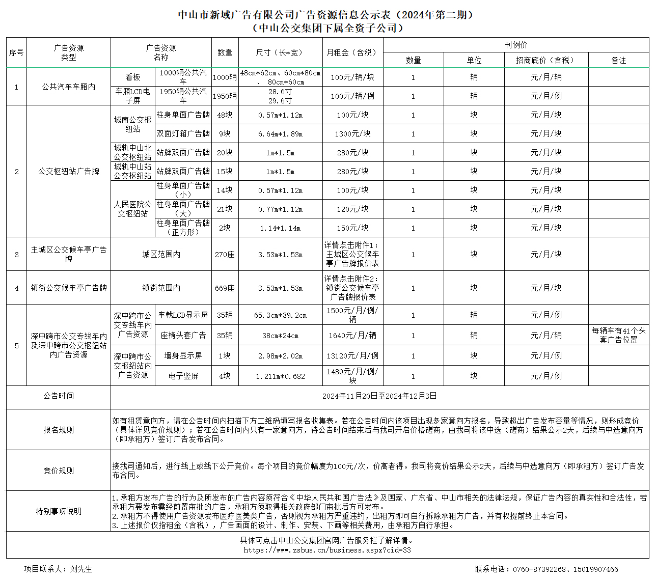中山市新域广告有限公司广告资源信息公示表(2024年第二期)(中山公交集团下属全资子公司)