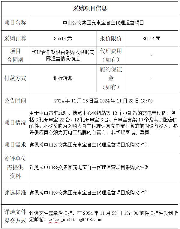 中山市公共交通运输集团有限公司充电宝自主代理运营项目
