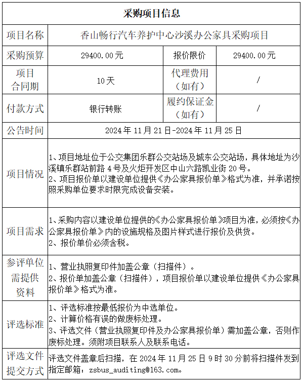 中山市公共交通运输集团有限公司香山畅行汽车养护中心沙溪办公家具采购项目