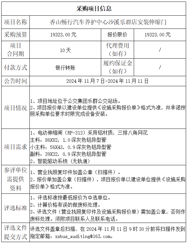 中山市公共交通运输集团有限公司香山畅行汽车养护中心沙溪乐群店安装伸缩门