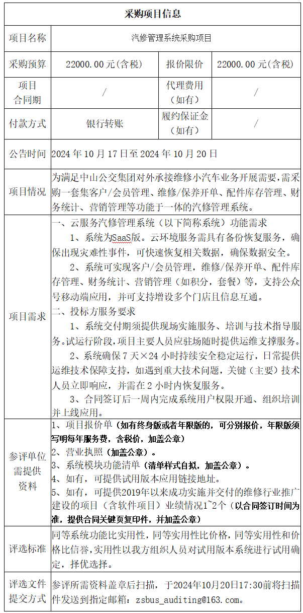 中山市公共交通运输集团有限公司汽修管理系统采购项目