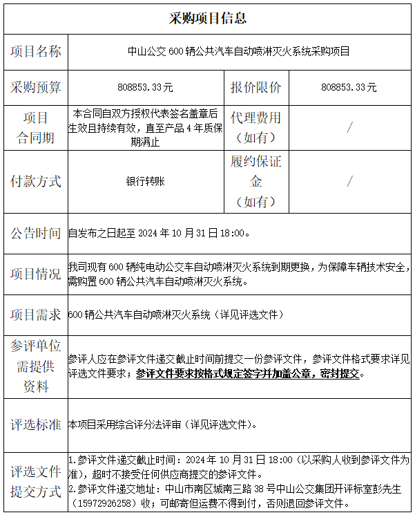 中山市公共交通运输集团有限公司中山公交600辆公共汽车自动喷淋灭火系统采购项目
