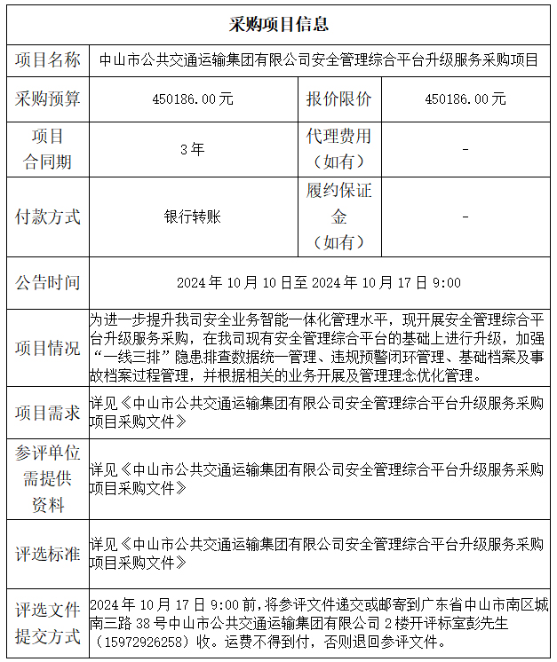 中山市公共交通运输集团有限公司安全管理综合平台升级服务采购项目