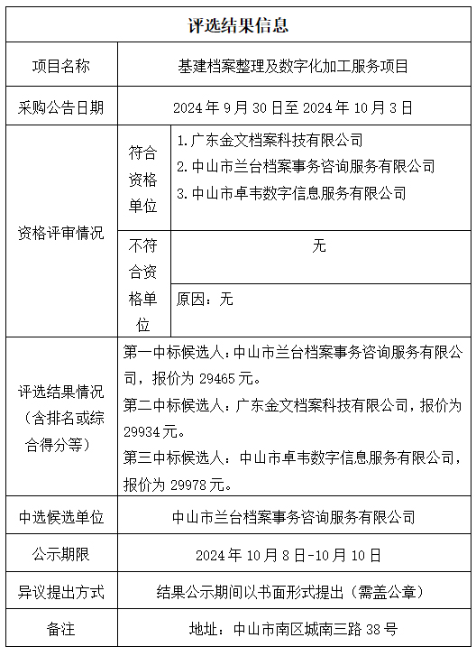 中山市公共交通运输集团有限公司基建档案整理及数字化加工服务项目评选结果公示