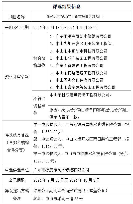 中山市公共交通运输集团有限公司乐群公交站场员工饭堂墙面翻新项目评选结果公示