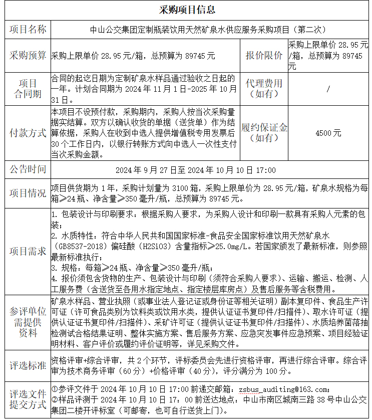 中山市公共交通运输集团有限公司定制瓶装饮用天然矿泉水供应服务采购项目(第二次)